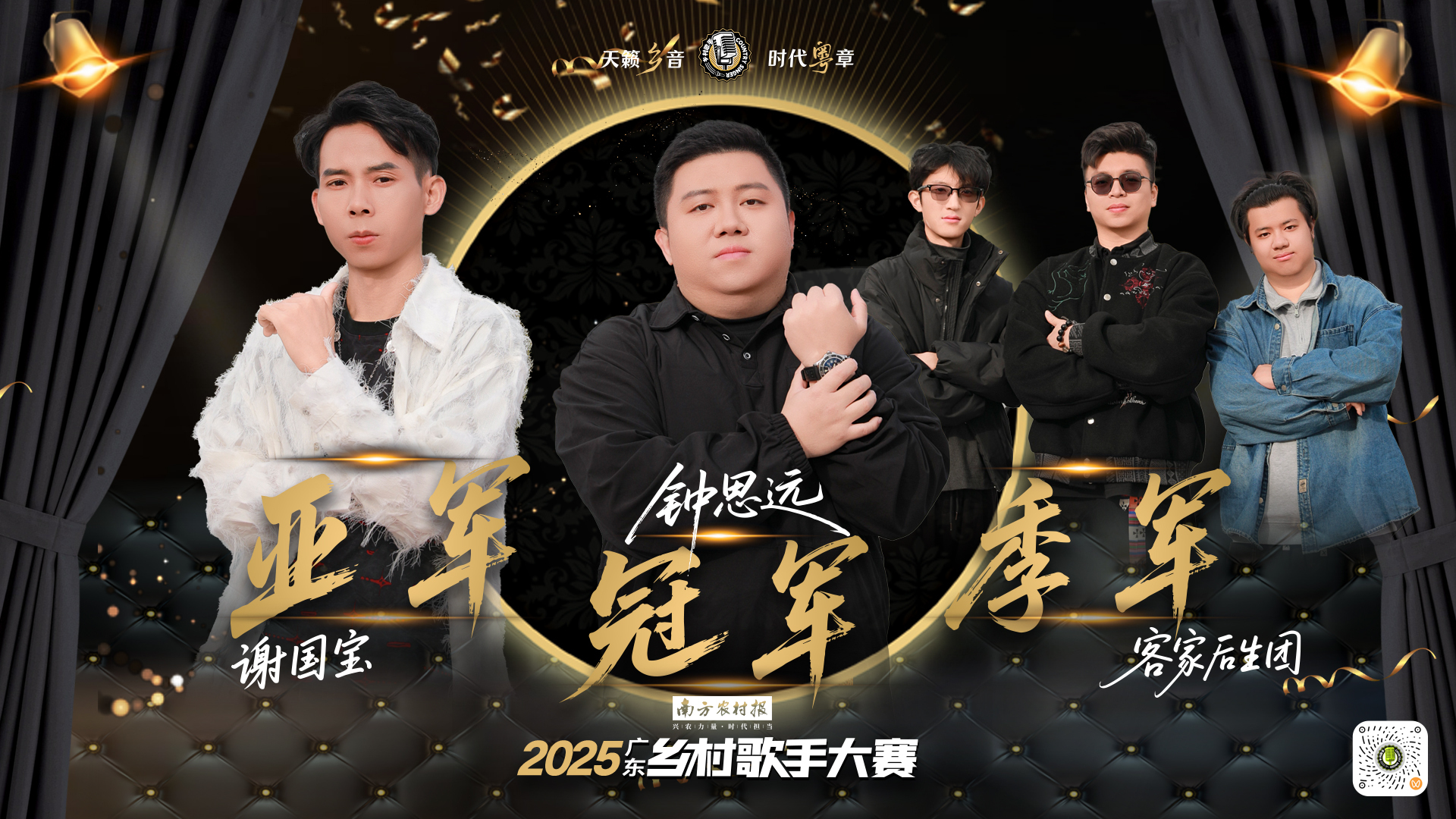聚光灯下,来自汕尾陆丰的钟思远摘得2025广东乡村歌手大赛桂冠,获得十万元现金大奖。来自肇庆广宁的谢国宝和来自梅州的客家后生团分别获得亚军和季军。从田间地头到总决赛舞台,他们用歌声完成了从平凡到不凡的跨越。