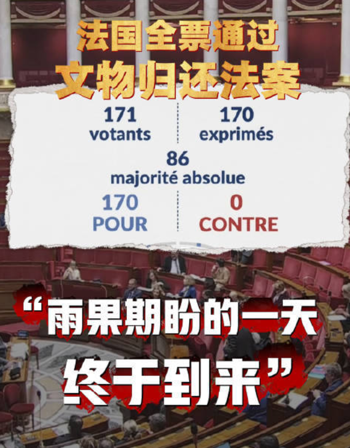 当地时间4月13日,法国国民议会以170票赞成、0票反对通过一项法案,将简化法国在殖民时期掠夺所得文物的归还程序。议员热雷米·帕特里耶-莱图斯发言时,说到法国文豪维克多·雨果的梦想:“法兰西能脱胎换骨,将不义之财归还被抢掠的中国”,他直言“这一天终于到来”。