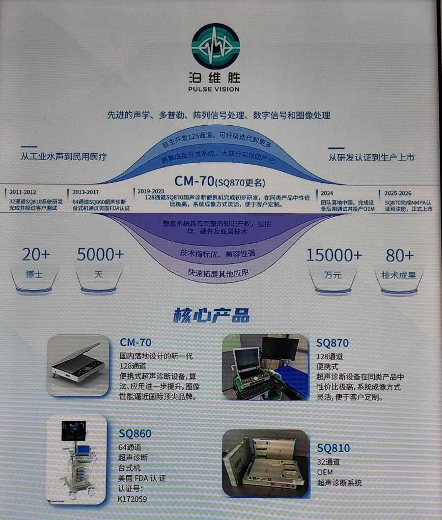 核心团队在硬件、固件、算法到软件应用等方面的积累非常成熟。在国外时,团队就已开始将工业超声产品转向医疗超声。杨博士介绍,这是一个非常浩大的工程,也具有相当的挑战性和难度。在近八九年的时间里,20余名硕士、博士研发人员协同攻关,彻底攻克了核心技术难题。凭借过硬的技术实力,团队研发的医疗产品成功获得美国 FDA 认证,不仅证明了产品的安全性与有效性,也为后续的国产化落地奠定了坚实基础。